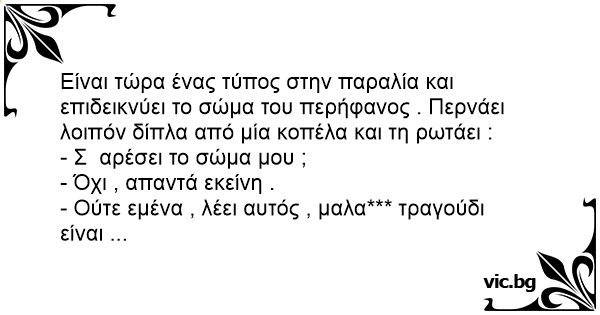 Είναι τώρα ένας τύπος στην παραλία και επιδεικνύει το σώμα του περήφανος . Περνάει λοιπόν δίπλα από μία κοπέλα και τη ρωτάει :