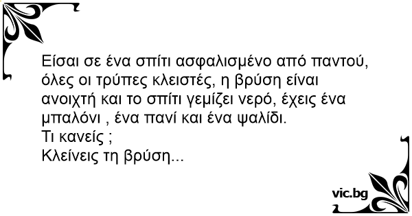 Είσαι σε ένα σπίτι ασφαλισμένο από παντού, όλες οι τρύπες κλειστές, η βρύση είναι ανοιχτή και το σπίτι γεμίζει νερό, έχεις ένα μπαλόνι , ένα πανί και ένα ψαλίδι.