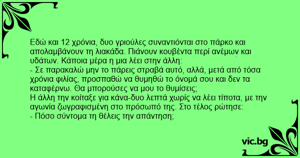 Εδώ και 12 χρόνια, δυο γριούλες συναντιόνται στο πάρκο και απολαμβάνουν τη λιακάδα. Πιάνουν κουβέντα περί ανέμων και υδάτων. Κάποια μέρα η μια λέει στην άλλη: