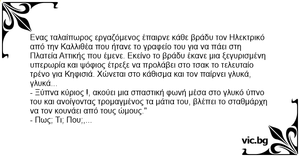 Ενας ταλαίπωρος εργαζόμενος έπαιρνε κάθε βράδυ τον Ηλεκτρικό από την Καλλιθέα που ήτανε το γραφείο του για να πάει στη Πλατεία Αττικής που έμενε. Εκείνο το βράδυ έκανε μια ξεγυρισμένη υπερωρία και ψόφιος έτρεξε να προλάβει στο τσακ το τελευταίο τρένο για Κηφισιά. Χώνεται στο κάθισμα και τον παίρνει γλυκά, γλυκά...