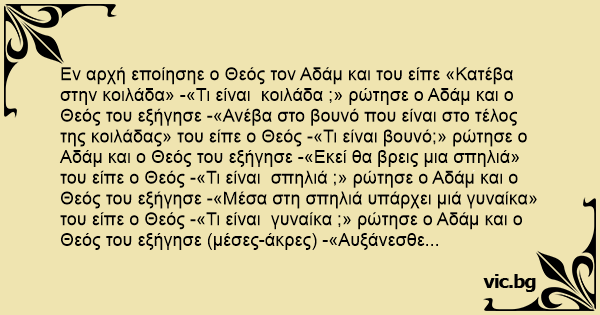 Εν αρχή εποίησηε ο Θεός τον Αδάμ και του είπε «Κατέβα στην κοιλάδα» -«Τι είναι κοιλάδα ;» ρώτησε ο Αδάμ και ο Θεός του εξήγησε -«Ανέβα στο βουνό που είναι στο τέλος της κοιλάδας» του είπε ο Θεός -«Τι είναι βουνό;» ρώτησε ο Αδάμ και ο Θεός του εξήγησε -«Εκεί θα βρεις μια σπηλιά» του είπε ο Θεός -«Τι είναι σπηλιά ;» ρώτησε ο Αδάμ και ο Θεός του εξήγησε -«Μέσα στη σπηλιά υπάρχει μιά γυναίκα» του είπε ο Θεός -«Τι είναι γυναίκα ;» ρώτησε ο Αδάμ και ο Θεός του εξήγησε (μέσες-άκρες) -«Αυξάνεσθε και πληθύνεστε» του είπε ο Θεός -«Τι είναι Αυξάνεσθε και πληθύνεστε ;» ρώτησε ο Αδάμ και ο Θεός του εξήγησε Ξεκίνησε λοιπόν ο Αδάμ, κατέβηκε την κοιλάδα, ανέβηκε στο βουνό, βρήκε τη σπηλιά, μπήκε στη σπηλιά, βρήκε τη γυναίκα, και μετά από 15 λεπτά βγήκε από τη σπηλιά, κατέβηκε το βουνό, διέσχισε την κοιλάδα και πλησίασε τον Κύριο και τον ρώτησε: