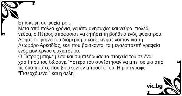 Μετά από πολλά χρόνια, γεμάτα ανησυχίες και νεύρα, πολλά νεύρα, ο Πέτρος αποφάσισε να ζητήσει τη βοήθεια ενός ψυχίατρου. Αφησε το φτηνό του διαμέρισμα και ξεκίνησε λοιπόν για τη Λεωφόρο Αρκαδίας, εκεί που βρίσκονται τα μεγαλοπρεπή γραφεία ενός μοντέρνου ψυχιατρείου.
