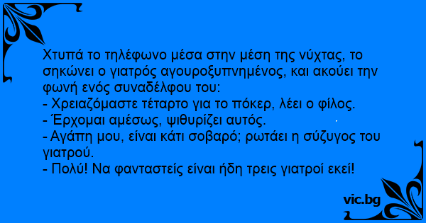 Приятели звънят на наскоро оженил се лекар, за да го поканят на партия бридж. - Спешен случай скъпа, трябва да тръгвам! - казва той на жена си и започва бързо да се облича. - Нещо сериозно ли е? -...