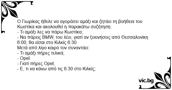- Να πάρεις BMW, του λέει, γιατί αν ξεκινήσεις από Θεσσαλονίκη 6:00, θα είσαι στο Κιλκίς 6:30.