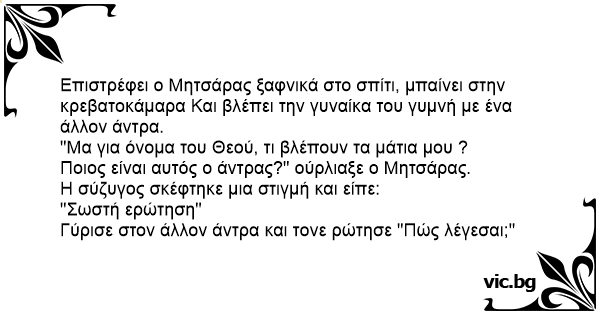 Επιστρέφει ο Μητσάρας ξαφνικά στο σπίτι, μπαίνει στην κρεβατοκάμαρα Και βλέπει την γυναίκα του γυμνή με ένα άλλον άντρα.