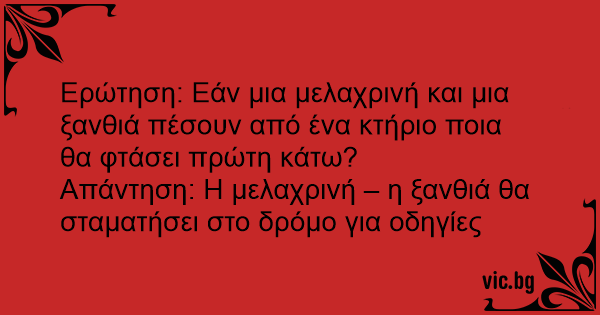 Det var en blondine og en brunette som falt ned fra en skyskraper, hvem traff bakken først? Svar: Brunetten, fordi blondinen måtte stoppe fire ganger og spørre etter vegen