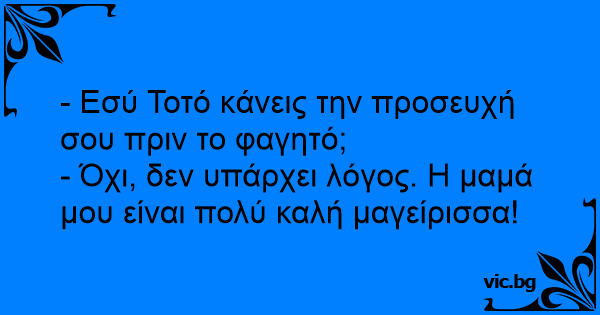 Jaimito rezando antes de comer Οχι βεβαια! Προσευχή στο φαγητό Свекървата казва на снахата: Батюшка спрашивает у прихожанина: "Verlangen deine Eltern von dir, dass du vor dem Essen betest?", erkundigt sich der Pfarrer. Teacher: Now, Ramu, tell me frankly do you say prayers before eating? В монастыре, монах Вовочке: A professora de Joãozinho pergunta: Κωστάκη κάνεις το σταυρό σου πριν φας? Andrea va per la prima volta a casa del suo compagno di classe Giulio; durante il pomeriggio fanno i compiti, giocano e poi Andrea viene invitato a rimanere a cena. — Joãozinho, me diga sinceramente, você ora antes de cada refeição? Sunday school teacher asks Johnny, "Come now, Little Johnny, tell me the truth, do you say your prayers before eating?" Little Johnny smiles proudly, "No Miss, there's no need, my mom cooks really well." A professora pergunta aos alunos: — Quem aqui reza antes das refeições? Todos levantam a mão, menos Joãozinho. — Joãozinho! Você não reza antes das refeições? — Não, fessora... Lá em casa não precisa! A minha mãe cozinha bem! Jeden przedszkolak mówi do drugiego: - U mnie modlimy się przed każdym posiłkiem. - U mnie nie. Moja mama bardzo dobrze gotuje. La profesora le dice a Jaimito: - Jaimito; contesta sinceramente... ¿rezas antes de cada comida? Y Jaimito responde: - No maestra, mi madre es buena cocinera! Kees tegen Jantje: "Moeten jullie ook altijd bidden voor het eten?"Jantje: "Nee,  mijn moeder kan goed koken." Le curé demande à Toto : - Toto, est-ce que tu fais bien ta prière avant de manger ? - Non, monsieur le curé, je n'ai pas besoin de faire une prière. Maman fait très bien la cuisine! - Jorgito, ¿Vos no rezás antes de comer? - No señorita, mi mamá cocina muy bien. Священик - хлопцеві: - Ти читаєш молитву перед їжею? - Ні. Моя мати добре готує. Rukoillaanko teillä koulussa ennen ruokailua? tiedusteli äiti ekaluokkalaiselta. Ei meidän tarvitse. Opettaja sanoi, että meidän koulussa on tosi hyvät keittäjät. - Jaimito, ¿tú no rezas antes de comer? - No, mi madre es buena cocinera. Pikku-Kallelta kysyttiin pyhäkoulussa, luettiinko heidän perheessään ruokarukous ennen jokaista ateriaa. Pikku-Kalle vastasi ylpeänä: - Ei meidän tarvitse, meidän äiti on aika hyvä kokki. - Tu iti faci rugaciunea la masa, inainte de a Incepe sa maninci? - Nu e nevoie. Nu gateste nevasta-mea, ci Subsemnatul. Mokytojas klausia Petriuko: - Petriuk, ar tu meldiesi prieš valgant? Petriukas atsako: - Ne, mano mama skaniai gamina valgyt. - Jaimito tu rezas antes de comer? - No maestra,esta bien que mi mamá no cocine muy bien pero no es para tanto. Læreren til Lille Peder: - Beder I bordbøn derhjemme. Peder: - Nej, min mor laver god mad. Mācītājs jautā puikam: - Vai tu pirms ēšanas Dievu lūdzi? - Nē, mamma gatavo labi.