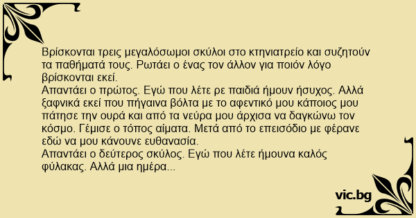 Βρίσκονται τρεις μεγαλόσωμοι σκύλοι στο κτηνιατρείο και συζητούν τα παθήματά τους. Ρωτάει ο ένας τον άλλον για ποιόν λόγο βρίσκονται εκεί.