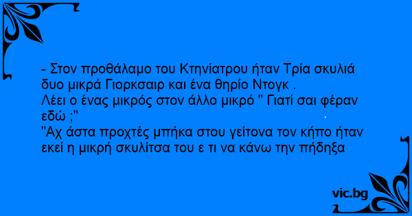 - Στον προθάλαμο του Κτηνίατρου ήταν Τρία σκυλιά δυο μικρά Γιορκσαιρ και ένα θηρίο Ντογκ .