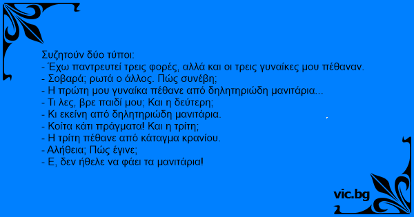 - Hur dog din första man! - Han åt giftig svamp. - Hur dog din andra man? - Han åt giftig svamp. - Hur dog din tredje man? - Honom slog jag ihjäl - Varför det? - Han vägrade äta min...
