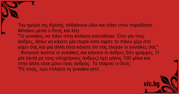 Την ημέρα της Κρίσης πεθαίνουν όλοι και πάνε στον παράδεισο. Μπαίνει μέσα ο Θεός και λέει: