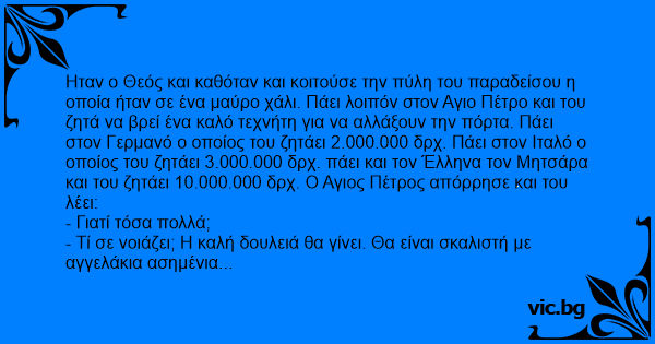 Ηταν ο Θεός και καθόταν και κοιτούσε την πύλη του παραδείσου η οποία ήταν σε ένα μαύρο χάλι. Πάει λοιπόν στον Αγιο Πέτρο και του ζητά να βρεί ένα καλό τεχνήτη για να αλλάξουν την πόρτα. Πάει στον Γερμανό ο οποίος του ζητάει 2.000.000 δρχ. Πάει στον Ιταλό ο οποίος του ζητάει 3.000.000 δρχ. πάει και τον Έλληνα τον Μητσάρα και του ζητάει 10.000.000 δρχ. Ο Αγιος Πέτρος απόρρησε και του λέει: