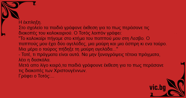 Στο σχολείο τα παιδιά γράφανε έκθεση για το πως περάσανε τις διακοπές του καλοκαιριού. Ο Τοτός λοιπόν γράφει: