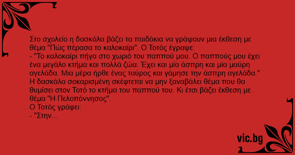 - "Το καλοκαίρι πήγα στο χωριό του παππού μου. Ο παππούς μου έχει ένα μεγάλο κτήμα και πολλά ζώα. Έχει και μία άσπρη και μία μαύρη αγελάδα. Μια μέρα ήρθε ένας ταύρος και γάμησε την άσπρη αγελάδα."