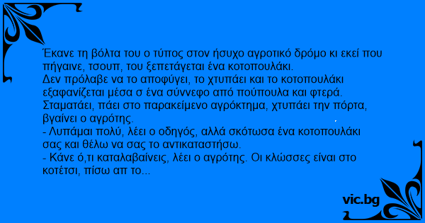 Έκανε τη βόλτα του ο τύπος στον ήσυχο αγροτικό δρόμο κι εκεί που πήγαινε, τσουπ, του ξεπετάγεται ένα κοτοπουλάκι.
