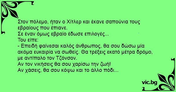 - Επειδή φαίνεσαι καλός άνθρωπος, θα σου δώσω μία ακόμα ευκαιρία να σωθείς. Θα τρέξεις εκατό μέτρα δρόμο, με αντίπαλο τον Τζόνσον.