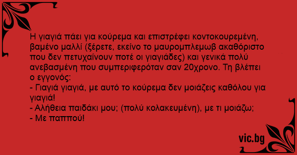 Η γιαγιά πάει για κούρεμα και επιστρέφει κοντοκουρεμένη, βαμένο μαλλί (ξέρετε, εκείνο το μαυρομπλεμωβ ακαθόριστο που δεν πετυχαίνουν ποτέ οι γιαγιάδες) και γενικά πολύ ανεβασμένη που συμπεριφερόταν σαν 20χρονο. Τη βλέπει ο εγγονός: