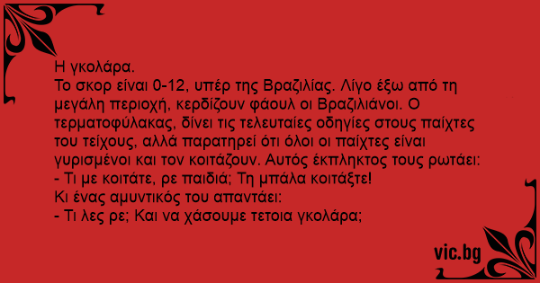 Το σκορ είναι 0-12, υπέρ της Βραζιλίας. Λίγο έξω από τη μεγάλη περιοχή, κερδίζουν φάουλ οι Βραζιλιάνοι. Ο τερματοφύλακας, δίνει τις τελευταίες οδηγίες στους παίχτες του τείχους, αλλά παρατηρεί ότι όλοι οι παίχτες είναι γυρισμένοι και τον κοιτάζουν. Αυτός έκπληκτος τους ρωτάει: