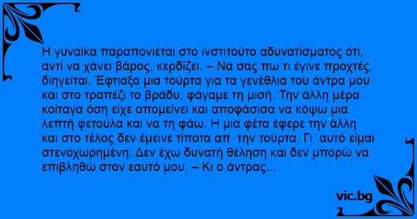 Η γυναίκα παραπονιέται στο ινστιτούτο αδυνατίσματος ότι, αντί να χάνει βάρος, κερδίζει. – Να σας πω τι έγινε προχτές, διηγείται. Έφτιαξα μια τούρτα για τα γενέθλια του άντρα μου και στο τραπέζι το βράδυ, φάγαμε τη μισή. Την άλλη μέρα κοίταγα όση είχε απομείνει και αποφάσισα να κόψω μια λεπτή φετούλα και να τη φάω. Η μια φέτα έφερε την άλλη και στο τέλος δεν έμεινε τίποτα απ  την τούρτα. Γι  αυτό είμαι στενοχωρημένη: Δεν έχω δυνατή θέληση και δεν μπορώ να επιβληθώ στον εαυτό μου. – Κι ο άντρας σου τι είπε, όταν διαπίστωσε ότι είχες φάει και την υπόλοιπη μισή τούρτα; ρώτησε μια άλλη χοντρή. – Δεν το κατάλαβε, γιατί αμέσως έφτιαξα μια άλλη τούρτα κι έφαγα τη μισή.