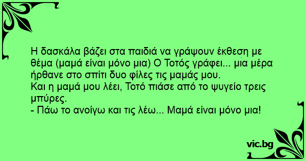 Η δασκάλα βάζει στα παιδιά να γράψουν έκθεση με θέμα (μαμά είναι μόνο μια) Ο Τοτός γράφει... μια μέρα ήρθανε στο σπίτι δυο φίλες τις μαμάς μου. Και η μαμά μου λέει, Τοτό πιάσε από το ψυγείο τρεις μπύρες. - Πάω το ανοίγω και τις λέω... Μαμά είναι μόνο μια!