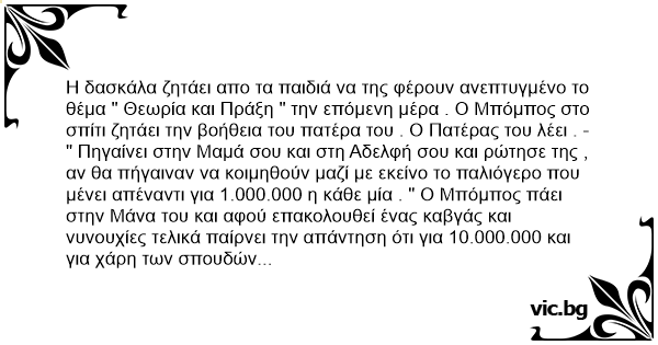 Η δασκάλα ζητάει απο τα παιδιά να της φέρουν ανεπτυγμένο το θέμα " Θεωρία και Πράξη " την επόμενη μέρα . Ο Μπόμπος στο σπίτι ζητάει την βοήθεια του πατέρα του . Ο Πατέρας του λέει . - " Πηγαίνει στην Μαμά σου και στη Αδελφή σου και ρώτησε της , αν θα πήγαιναν να κοιμηθούν μαζί με εκείνο το παλιόγερο που μένει απέναντι για 1.000.000 η κάθε μία . " Ο Μπόμπος πάει στην Μάνα του και αφού επακολουθεί ένας καβγάς και νυνουχίες τελικά παίρνει την απάντηση ότι για 10.000.000 και για χάρη των σπουδών των παιδιών της θα το έκανε . Στην συνέχεια πάει στην 17χρονη αδελφή του και εκεί αφού γίνεται άλλος καβγάς , παίρνει την απάντηση ότι για 10.000.000 θα πήγαινε αφού έτσι θα μπορούσε να γίνει μοντέλο . Ο Μπόμπος επιστρέφει στο πατέρα του και του λέει τις απαντήσεις. Και τότε ο πατέρας του λέει :