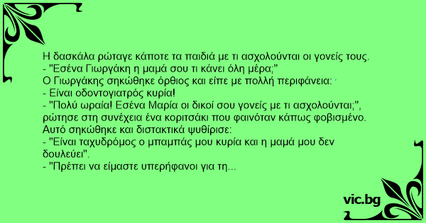- "Πρέπει να είμαστε υπερήφανοι για τη δουλειά που κάνουν οι γονείς μας", είπε η δασκάλα θέλοντας να την εμψυχώσει. "Εσένα Νίκο τι δουλειά κάνει ο μπαμπάς σου", συνέχισε ρωτώντας ένα πιτσιρικά που φαινότανε διαολάκι.