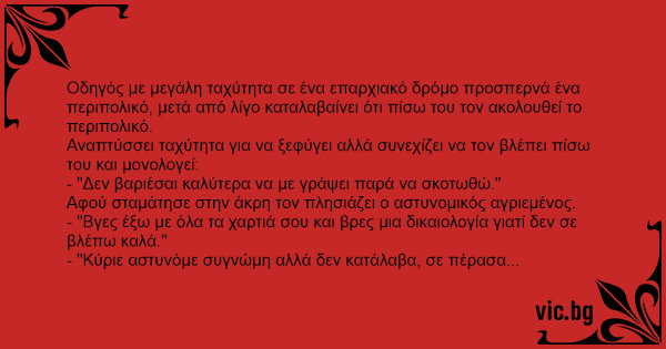 Οδηγός με μεγάλη ταχύτητα σε ένα επαρχιακό δρόμο προσπερνά ένα περιπολικό, μετά από λίγο καταλαβαίνει ότι πίσω του τον ακολουθεί το περιπολικό.