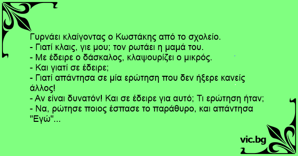 - Mi volt ma az iskolában, kisfiam? - Anya, ma én voltam az egyetlen aki jelentkezett, amikor a tanítónéni kérdést tett fel! - Nagyon ügyes vagy Pistike! És mi volt a kérdés? - Ki törte be az ablakot?