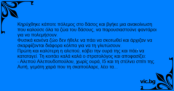 Κηρύχθηκε κάποτε πόλεμος στο δάσος και βγήκε μια ανακοίνωση που καλούσε όλα τα ζώα του δάσους, να παρουσιαστούνε φαντάροι για να πολεμήσουν.