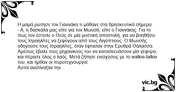 - Α, η δασκάλα μας είπε για τον Μωυσή, είπε ο Γιαννάκης. Για το πως τον έστειλε ο Θεός σε μία μυστική αποστολή, για να βοηθήσει τους Ισραηλίτες να ξεφύγουν από τους Αιγύπτιους. Ο Μωυσής οδηγούσε τους Ισραηλίτες, όταν έφτασαν στην Ερυθρά Θάλασσα.