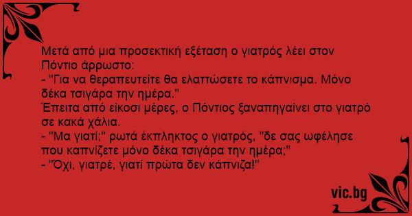 - "Μα γιατί;" ρωτά έκπληκτος ο γιατρός, "δε σας ωφέλησε που καπνίζετε μόνο δέκα τσιγάρα την ημέρα;"