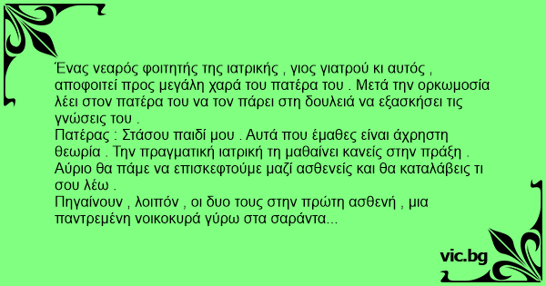 Ένας νεαρός φοιτητής της ιατρικής , γιος γιατρού κι αυτός , αποφοιτεί προς μεγάλη χαρά του πατέρα του . Μετά την ορκωμοσία λέει στον πατέρα του να τον πάρει στη δουλειά να εξασκήσει τις γνώσεις του . Πατέρας : Στάσου παιδί μου . Αυτά που έμαθες είναι άχρηστη θεωρία . Την πραγματική ιατρική τη μαθαίνει κανείς στην πράξη . Αύριο θα πάμε να επισκεφτούμε μαζί ασθενείς και θα καταλάβεις τι σου λέω . Πηγαίνουν , λοιπόν , οι δυο τους στην πρώτη ασθενή , μια παντρεμένη νοικοκυρά γύρω στα σαράντα κατάκοιτη από τους πόνους στη μέση . Ο πατέρας γιατρός πάει να της γράψει τη συνταγή , του πέφτει ο στύλος στο πάτωμα , τον μαζεύει και λέει στη γυναίκα : Πατέρας : Κυρία μου , θα πρέπει να κουράζεστε λιγότερο . Δουλεύετε πάρα πολύ μέσα στο σπίτι και δεν κάνει . Λίγη ανάπαυση δεν βλάπτει . Γυναίκα : Έχετε δίκιο γιατρέ μου κι ο άνδρας μου μου το λέει αλλά δεν τον ακούω . Θέλω να είναι όλα στην εντέλεια μέσα στο σπίτι , το χω πάρει απ τη μάνα μου . Όταν βγήκαν από το διαμέρισμα λέει ο γιατρός junior στο μεγάλο : Γιος : Πώς κατάλαβες ότι κάνει πολλές δουλειές ; Πατέρας : Να , παιδί μου . άφησα το στυλό να πέσει χάμω , επίτηδες . Όταν έσκυψα να τον μαζέψω είδα ότι το πάτωμα έλαμπε από καθαριότητα . Δεν υπήρχε σκόνη ούτε για δείγμα . Έτσι κατάλαβα ότι η γυναίκα σκοτώνεται στη δουλειά . Την επόμενη ασθενή θα την εξετάσεις εσύ να δούμε τι έμαθες . Φτάνουν στην επόμενη ασθενή και την βρίσκουν κατάκοιτη στο κρεβάτι . Πάει ο μικρός γιατρός να γράψει τη συνταγή , αφήνει το στυλό να πέσει στο πάτωμα , τον μαζεύει και λέει : Γιος : Κυρία μου , κουράζεστε πολύ . Κάνετε πάρα πολλές δουλειές για την ενορία αλλά θα πρέπει να τις μετριάσετε λίγο , γιατί θα σας τρέχουμε στο νοσοκομείο . Δεν λέω , ευλογία Κυρίου είναι να εργάζεστε για την ενορία αλλά " παν μέτρον άριστον ". Γυναίκα : Αχ , ναι γιατρέ μου έχετε απόλυτο δίκιο . Θα πρέπει να δουλεύω λιγότερο για την ενορία . Όταν βγήκαν λέει ο πατέρας γεμάτος απορία : Πατέρας : Πώς κατάλαβες ότι εργάζεται για την ενορία ; Γιος : Να , όταν έσκυψα να μαζέψω τον στυλό , είδα τον παπά κάτω απ το κρεβάτι .