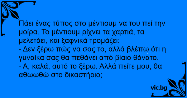 - Δεν ξέρω πώς να σας το, αλλά βλέπω ότι η γυναίκα σας θα πεθάνει από βίαιο θάνατο.
