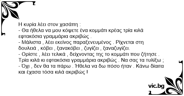 - Θα ήθελα να μου κόψετε ένα κομμάτι κρέας τρία κιλά εφτακόσια γραμμάρια ακριβώς .