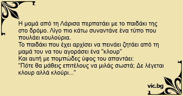 Η μαμά από τη Λάρισα περπατάει με το παιδάκι της στο δρόμο. Λίγο πιο κάτω συναντάνε ένα τύπο που πουλάει κουλούρια.