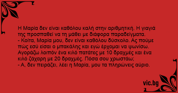 Η Μαρία δεν είναι καθόλου καλή στην αριθμητική. Η γιαγιά της προσπαθεί να τη μάθει με διάφορα παραδείγματα.