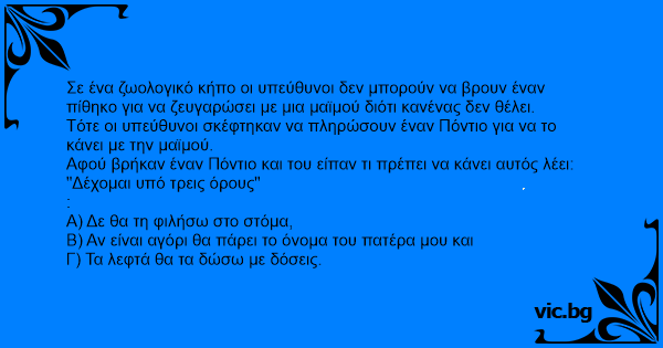 Σε ένα ζωολογικό κήπο οι υπεύθυνοι δεν μπορούν να βρουν έναν πίθηκο για να ζευγαρώσει με μια μαϊμού διότι κανένας δεν θέλει.