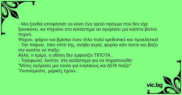 - Μια ξανθιά αποφάσισε να κάνει ένα τρελό πράγμα που δεν είχε ξανακάνει, κα πηγαίνει στο κατάστημα να αγοράσει μια κασέτα βίντεο πορνό.
