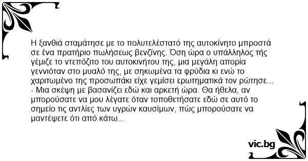 Η ξανθιά σταμάτησε με το πολυτελέστατό της αυτοκίνητο μπροστά σε ένα πρατήριο πωλήσεως βενζίνης. Όση ώρα ο υπάλληλος τής γέμιζε το ντεπόζιτο του αυτοκινήτου της, μια μεγάλη απορία γεννιόταν στο μυαλό της, με σηκωμένα τα φρύδια κι ενώ το χαριτωμένο της προσωπάκι είχε γεμίσει ερωτηματικά τον ρώτησε...
