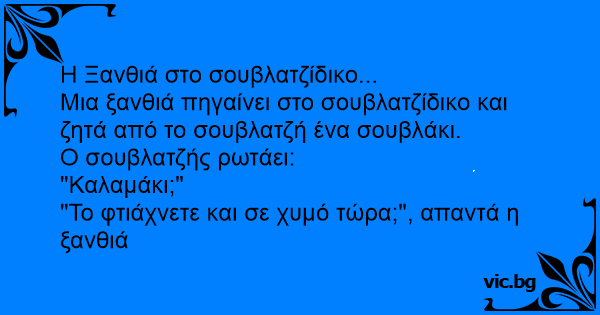Μια ξανθιά πηγαίνει στο σουβλατζίδικο και ζητά από το σουβλατζή ένα σουβλάκι.