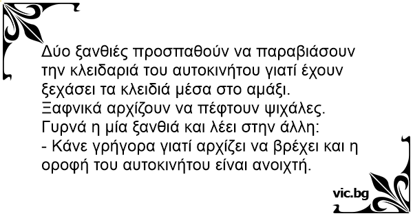 Πέρα βρέχει.... Две блондинки отиват на пазар. Блондинка на бензиностанция. Зарежда колата, отива, плаща, връща се, и... Класическа ситуация - ключът вътре, колата заключена... Eine Blondine stürmt in eine Werkstatt und hechelt: There were these two blonds and they locked their keys in their car. A blonde walks into a gas station and says to the manager, "I locked my keys in my car. Do you have a coat hanger or something I can stick through the window to unlock the door?" There are three blonds that went to the store. ,After they get done in the store one of the blondes realizes that she locked her keys in her car. ,The first blond tried using a screwdriver to unlock the door. ,The second blond tried using a hanger. ,The third blond tried using... Μια ξανθιά κλείδωσε τα κλειδιά της στο αυτοκίνητο. Πηγαίνει λοιπόν σε ένα συνεργείο και ζητάει ένα σύρμα για να τραβήξει την ασφάλεια από το λίγο ανοιχτό παράθυρο του αυτοκινήτου της. Έκπληκτος ο μηχανικός που μια ξανθιά μπόρεσε να σκεφθεί μια τέτοια λύση, της λέεί και βέβαια έχω σύρμα, αλλά θα... Två blondiner hade råkat låsa in sina nycklar i bilen. En av blondinerna försökte bryta sig in i bilen medans den andra kollade så att kusten var klar. Till sist gav den första blondinen upp och sa: - Jäklar, jag kan inte komma in i bilen.... Deux blondes sont dans un stationnement en train d'essayer de débarrer la porte de leur Mercedes avec un support car elles ont embarré les clefs a l'intérieur... La première blonde dit : - Maudit,... Twee blondjes staan bij de auto te sukkelen met het slot. Ze zijn namelijk de sleutel kwijt. Plots begint het zachtjes te regenen. Zegt het ene blondje tegen het andere: "Schiet op, het regent... Det var en gang to blondine som var å handlet. Da de kom tilbake til bilen, fant de ut at nøklen var låst inne. De to blondinene sto der i mange timer for å prøve å få opp døren, men til ingen... Sally and Brenda (both blondes) exited and locked the car in a hurry, forgetting to remove the key, which was in the ignition. Realizing the mistake, Sally asked, "Why don't we get a coat hanger... Δυο ξανθιές προσπαθούν να ξεκλειδώσουν την πόρτα του αυτοκινήτου τους με μια κρεμάστρα. Πρώτη ξανθιά: Δεν μπορώ να την ξεκλειδώσω αυτή την πόρτα Δεύτερη ξανθιά: Καλύτερα να βιαστείς. Έχει ξεκινήσει...