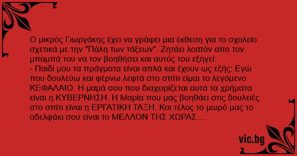 Ο μικρός Γιωργάκης έχει να γράψει μια έκθεση για το σχολείο σχετικά με την "Πάλη των τάξεων". Ζητάει λοιπόν απο τον μπαμπά του να τον βοηθήσει και αυτός του εξηγεί: - Παιδί μου τα πράγματα είναι απλά και έχουν ως εξής: Εγώ που δουλεύω και φέρνω λεφτά στο σπίτι είμαι το λεγόμενο ΚΕΦΑΛΑΙΟ. Η μαμά σου που διαχειρίζεται αυτά τα χρήματα είναι η ΚΥΒΕΡΝΗΣΗ. Η Μαρία που μας βοηθάει στις δουλειές στο σπίτι είναι η ΕΡΓΑΤΙΚΗ ΤΑΞΗ. Και τέλος το μωρό μας το αδελφάκι σου είναι το ΜΕΛΛΟΝ ΤΗΣ ΧΩΡΑΣ. Κατάλαβες τώρα; Μπορείς να γράψεις την έκθεσή σου; - Ναι μπαμπά, λέει ο Γιωργάκης και πάει στο δωμάτιό του. Αφού τελειώνει τα άλλα του μαθήματα ξεκινάει να γράψει την έκθεση, αλλά ακούει κάποιο θόρυβο μέσα στο σπίτι και πάει να δει. Βλέπει λοιπόν τον μπαμπά του να κάνει έρωτα με την υπηρέτρια τη Μαρία και τρέχει στη μαμά του η οποία όμως κοιμόταν ενώ στο διπλανό δωμάτιο ο μικρός κλαίει γοερά γιατί έχει ανάγκη από αλλαγή πάνας. Η έκθεση λοιπόν του Γιωργάκη ξεκινάει ως εξής: "Ένα είναι σίγουρο. Όταν το ΚΕΦΑΛΑΙΟ πηδάει την ΕΡΓΑΤΙΚΗ ΤΑΞΗ, η ΚΥΒΕΡΝΗΣΗ κοιμάται και το ΜΕΛΛΟΝ ΤΗΣ ΧΩΡΑΣ ΕΙΝΑΙ ΧΕΣΜΕΝΟ !".