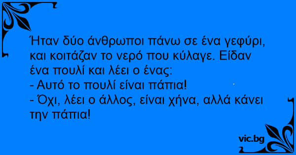 Ήταν δύο άνθρωποι πάνω σε ένα γεφύρι, και κοιτάζαν το νερό που κύλαγε. Είδαν ένα πουλί και λέει ο ένας: