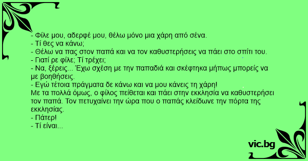 Με τα πολλά όμως, ο φίλος πείθεται και πάει στην εκκλησία να καθυστερήσει τον παπά. Τον πετυχαίνει την ώρα που ο παπάς κλείδωνε την πόρτα της εκκλησίας.