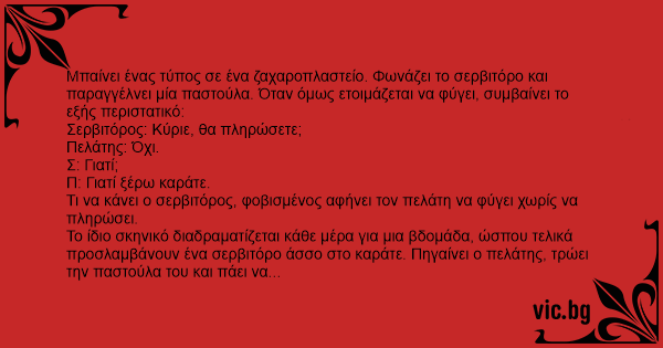Mπαίνει ένας τύπος σε ένα ζαχαροπλαστείο. Φωνάζει το σερβιτόρο και παραγγέλνει μία παστούλα. Όταν όμως ετοιμάζεται να φύγει, συμβαίνει το εξής περιστατικό: