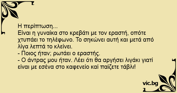 - Ο άντρας μου ήταν. Λέει ότι θα αργήσει λιγάκι γιατί είναι με εσένα στο καφενείο καί παίζετε τάβλι!