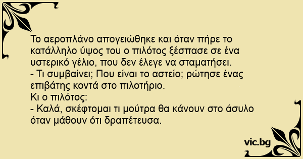Το αεροπλάνο απογειώθηκε και όταν πήρε το κατάλληλο ύψος του ο πιλότος ξέσπασε σε ένα υστερικό γέλιο, που δεν έλεγε να σταματήσει.