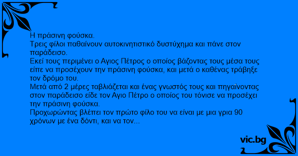 Μετά από 2 μέρες ταβλιάζεται και ένας γνωστός τους και πηγαίνοντας στον παράδεισο είδε τον Αγιο Πέτρο ο οποίος του τόνισε να προσέχει την πράσινη φούσκα.