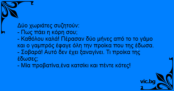 - Καθόλου καλά! Πέρασαν δύο μήνες από το το γάμο και ο γαμπρός έφαγε όλη την προίκα που της έδωσα.