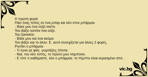 - Ε τότε τι καθόμαστε, λέει ο μπάρμαν, το πέμπτο είναι κερασμένο από εμένα!
